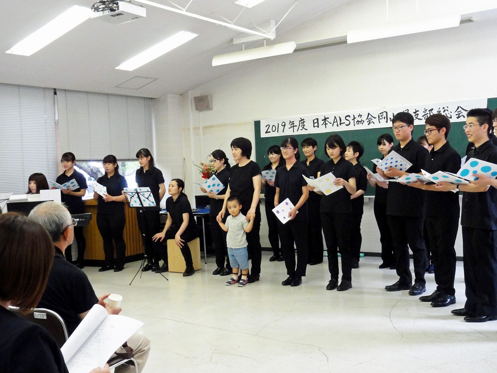 2019年7月20日13時より、独立行政法人国立病院機構南岡山医療センター王山荘において、日本ALS協会岡山県支部定期総会が開催されました。患者・家族・遺族の方々19名、専門職・医師・関係機関の方々14名、一般会員・ボランティアの方々3名、合計36名のご参加がありました。ありがとうございました。また今年も合唱団『こぶ』さんの合唱も聴かせていただき、感謝の気持ちでいっぱいです。皆様ご参加ありがとうございました。